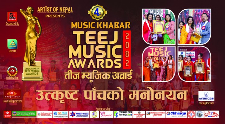 काठमाडौं- चौंथो म्युजिक खबर तीज म्युजिक अवार्ड २०८२ को उत्कृष्ट पाँचको मनोनयन सार्वजनिक भएको छ । आष्र्टिष्ट अफ नेपाल डटकमको प्रस्तुति एवं शुभकामना मिडिया सोलुशनको आयोजनामा विगत चार वर्षदेखि हुँदै आएको ‘म्युजिक खबर तीज म्युजिक अवार्ड’को चौंथो संस्करणको विभिन्न २१ विधामा उत्कृष्ट पाँचको मनोनयन सार्वजनिक गरिएको हो । २०८२ सालमा बजारमा आएका तीजका गीतहरुलाई समावेश गरी अवार्ड आयोजना गरिएको हो । अवार्डमा सर्वोत्कृष्ट मिक्सिङ, संगीत संयोजक, नवप्रतिभा, मोडल, निर्देशक, कोरियोग्राफर, छायाँकार, सम्पादक, गायक, गायिका, संयुक्त गायन लगायतका तीज दोहोरी र तीज मौलिक गीतका २१ विधाको सर्वोत्कृष्ट पाँच सार्वजनिक गरिएको अवार्डका अध्यक्ष सबिता पोखरेलले जानकारी दिइन् । तीज म्युजिक अवार्डको सर्वोत्कृष्ट पाँचबाट एक जनाले अवार्ड चुम्नेछन् ।